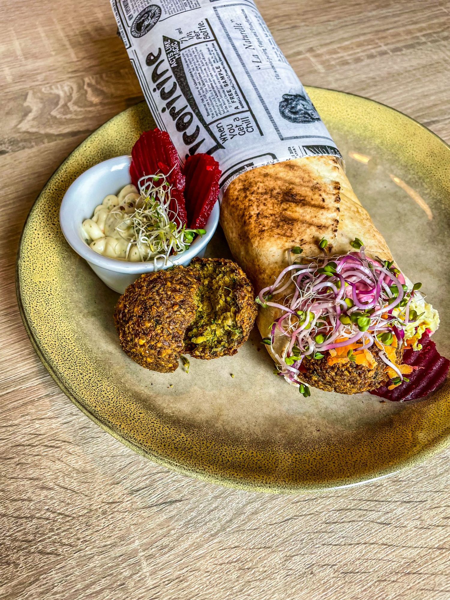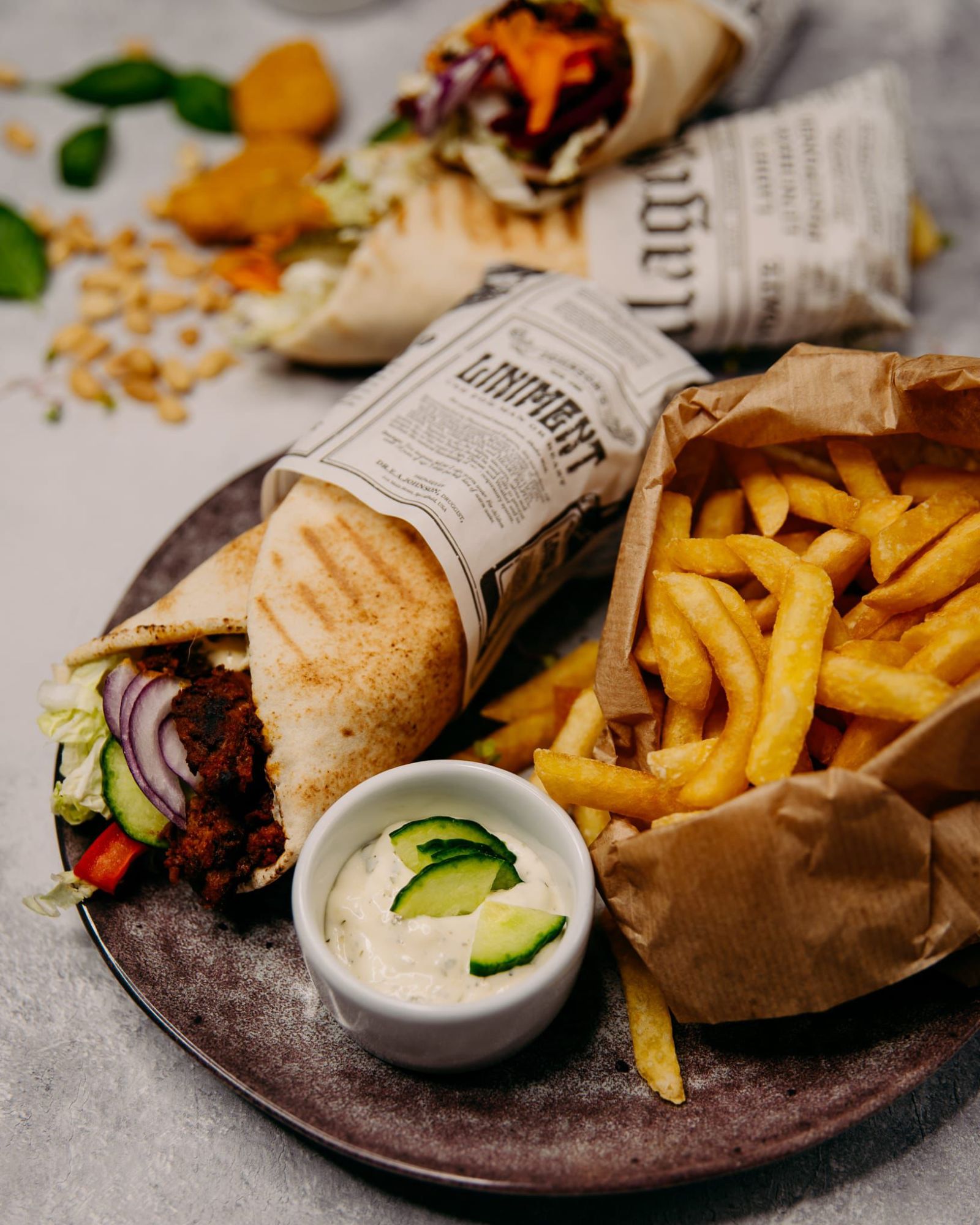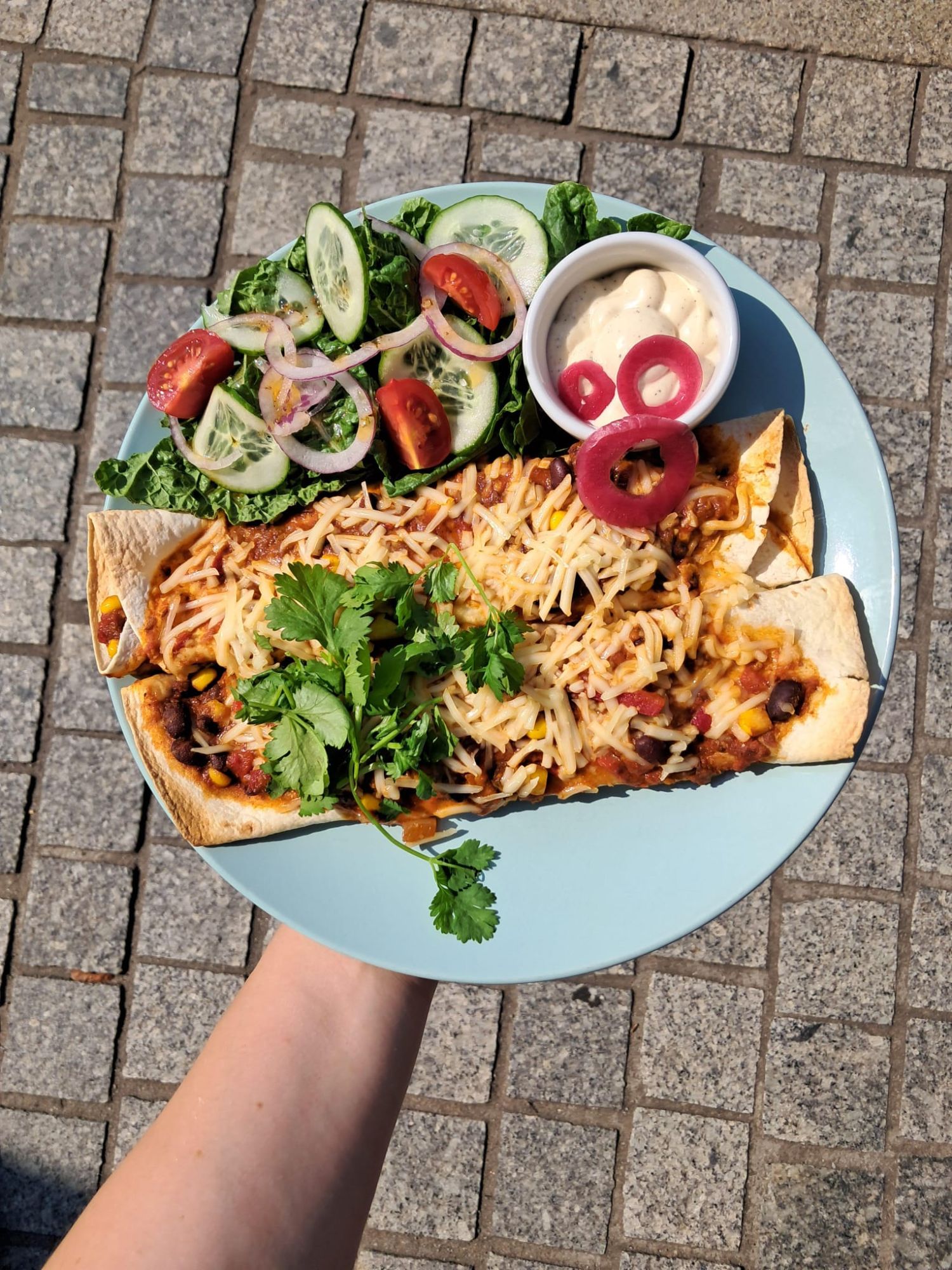 fryty (200g) zapiekane z dodatkiem sera violife/ pasta z czarnej fasoli/ "mięsko" seitan/ kukurydza/ nachosy/ jalapeno/ sriracha-majo/ prażona cebulka/ kiełki